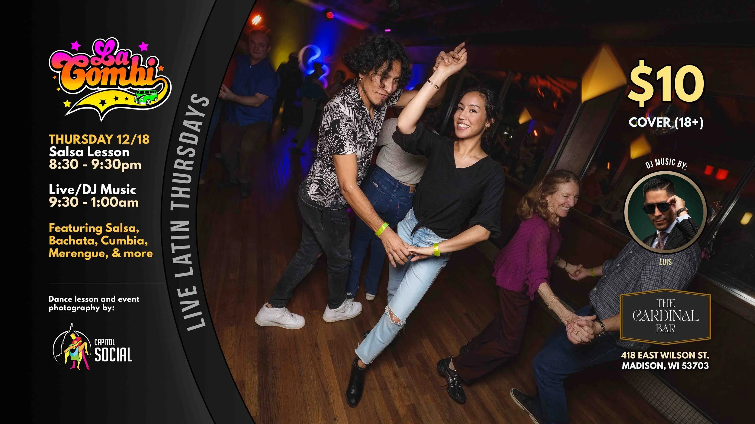 Join us for a special edition of Latin Thursdays at The Cardinal Bar! We’ll feature TWO 45-minute dance lessons: BACHATA at 8:30pm and SALSA at 9:15pm. We’ll offer 2 levels for each dance simultaneously! Dancing with DJ Luis follows until 1:00am! (our 2 bands are on a break this week) 💃🏼🎵